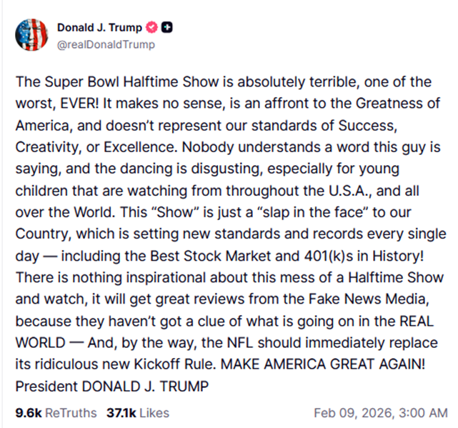 Ce fut d’abord au tour de Bad Bunny qui a été choisi par la NFL pour animer la mi-temps du Super Bowl et, pour aggraver son cas, s’est permis de chanter en Espagnol, une insulte à celui qui avait décidé de rebaptiser le Gulf of Mexico en Gulf of America,