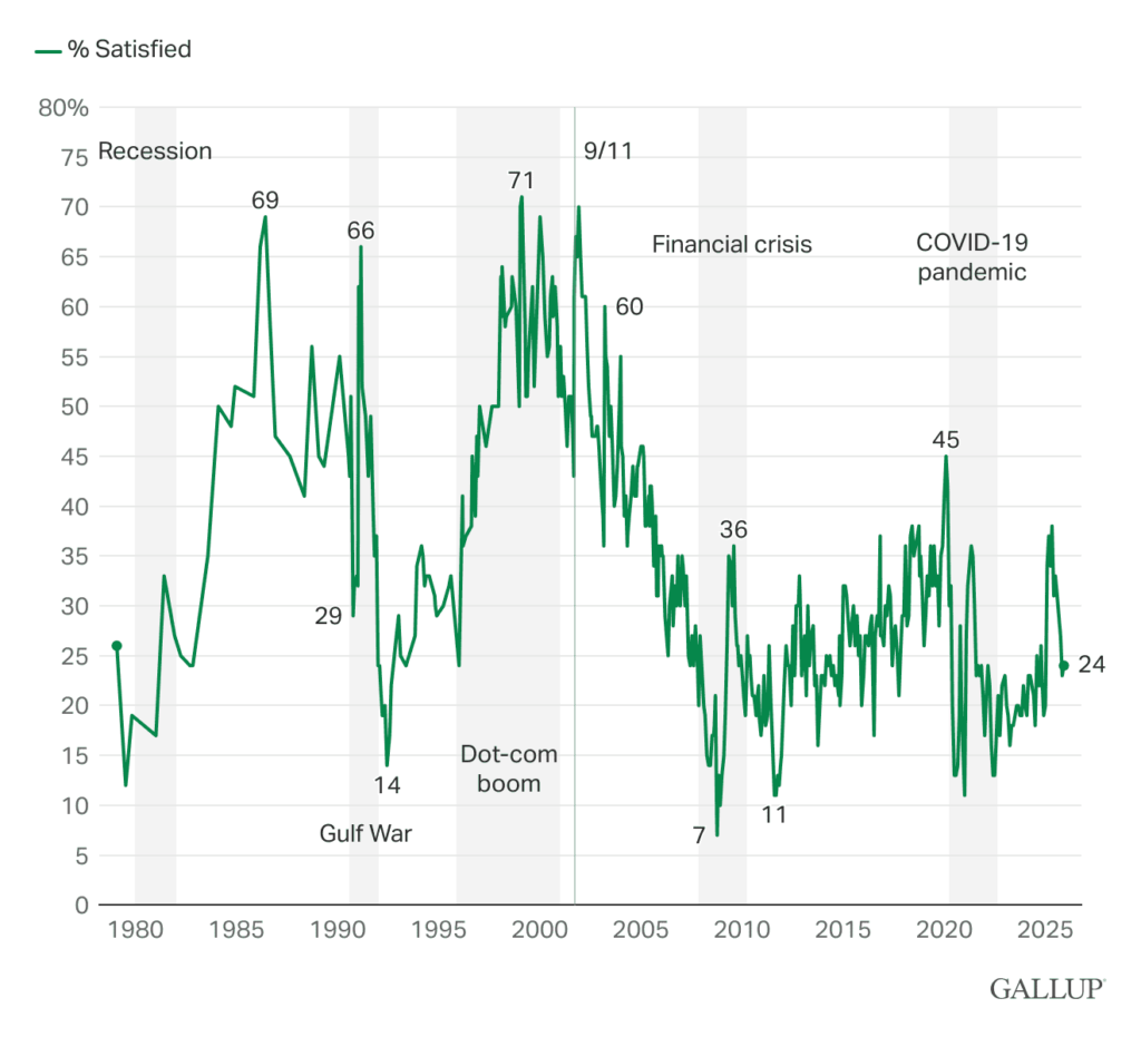 A la question de savoir comment les Américains apprécient la direction que prennent les États-Unis, seulement 24 % en sont satisfaits. C’est peu, mais il y a eu pire. En 1990, au moment de la première guerre du Golfe, ils n’étaient que 14 %. En 2009, 7 % au moment de la crise financière. Et guère plus en 2020 lorsque l’épidémie s’est déclenchée.