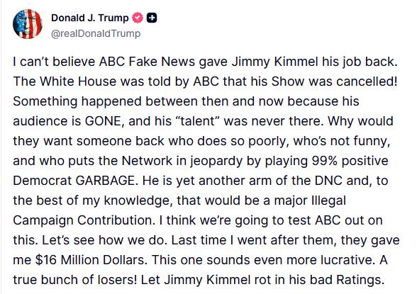 Finalement, la suspension de Jimmy Kimmy n’aura duré que quelques jours. Donald Trump ne semble pas s’en remettre. Il n’aura attendu que quelques heures pour manifester son mécontentement. Mais, Disney a, pour une fois, pris une décision courageuse, en bravant le pouvoir, ce qui, ces derniers temps, n’est pas si fréquent.