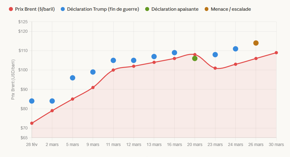 | 30 mars | Menace d’annihiler le réseau énergétique et les puits. | Atteint presque 117 $ (pic proche du record de 119,50 $). |