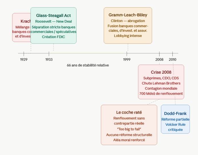 C’est la seconde qui est choisie. Résultat : les banques survivent intactes, leurs dirigeants gardent leurs bonus, et le principe du “too big to fail” est gravé dans les faits. La loi Dodd-Frank de 2010 introduit la Volcker Rule (limites sur les paris pour compte propre), mais elle ne rétablit pas la séparation structurelle et sera encore affaiblie en 2018 sous Trump.