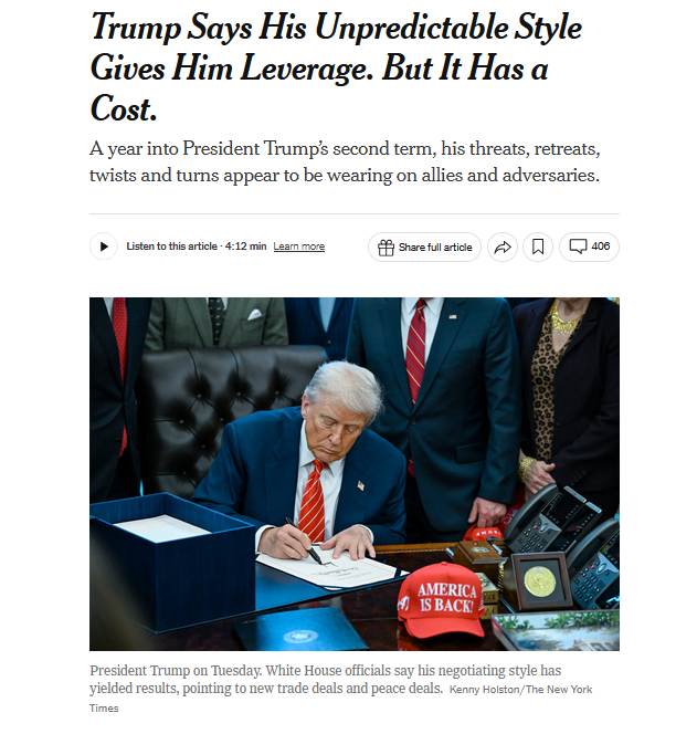 Dans un article récent, le New York Times (Trump Says His Unpredictable Style Gives Him Leverage. But It Has a Cost) tente de faire passer l’imprévisibilité de Donald Trump pour de la stratégie, de vision ou de méthode, Un examen des commentaires montre que les lecteurs n’adhèrent pas à ce discours et y voient plutôt «de l’arbitraire, de l’incompétence et de l’instabilité mentale ». Richard Nixon avait théorisé cette théorie du fou consistant à faire croire aux dirigeants des pays hostiles du bloc de l’Est qu’ils ont en face d’eux un dirigeant au comportement imprévisible, disposant d’une énorme capacité de destruction. Ainsi, ces pays hostiles ne devaient pas être tentés de provoquer les États-Unis, craignant une réponse américaine inattendue (Source : Wikipedia). Avec Donald Trump, on est passé dans un autre registre.