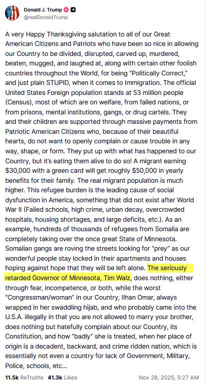 Pour preuve, le lendemain matin à 5h27 de la fête traditionnelle de Thanksgiving, il publie le tweet suivant mettant en cause et insultant Tim Walz, le gouverneur du Minnesota et ancien candidat à la vice-présidence.