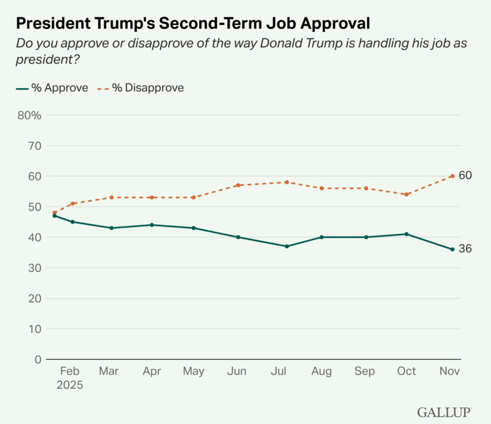 Le taux d’approbation du président Donald Trump est tombé à 36 %, à son niveau le plus bas de son second mandat, avec un taux de désapprobation à 60 %. Cette baisse, mesurée par un sondage Gallup (3 au 25 novembre), intervient après des élections partielles favorables aux démocrates et au milieu du plus long “shutdown” du gouvernement fédéral de l’histoire des États-Unis.