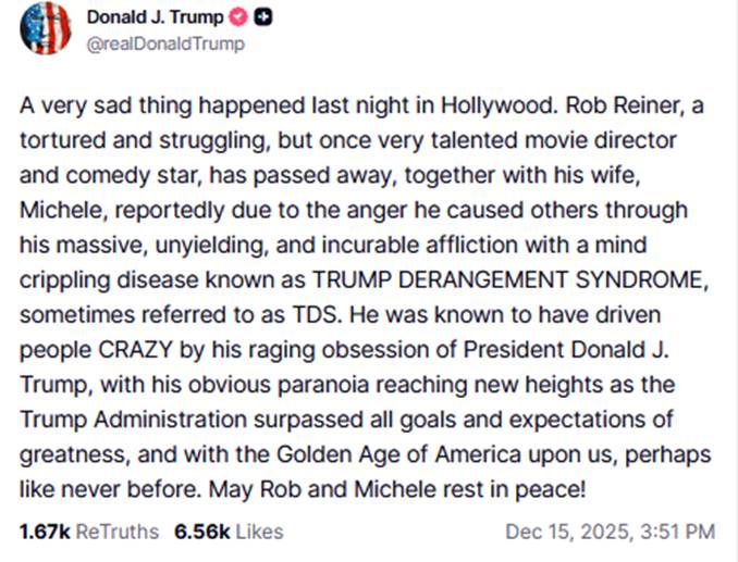 Tous les chemins mènent à Rome. Toute l’actualité du monde, chez Donald Trump, mène à lui. Absolument tout. Un conflit international, une catastrophe naturelle, un procès, un film, un adversaire politique, un artiste critique : rien n’existe hors de sa personne. L’événement n’est jamais qu’un prétexte à l’autocélébration ou à la vengeance verbale. Dans ce post, il ne s’agit pas seulement d’attaquer Rob Reiner, mais de rejouer une scène désormais familière : celle où Trump se pose en axe du monde, en centre gravitationnel de toute réalité, quitte à piétiner les faits les plus élémentaires.