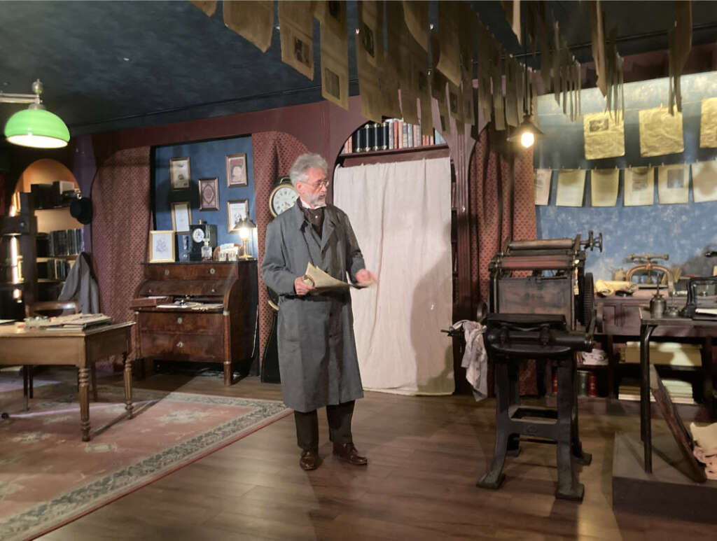 Le très divertissant spectacle Jules Verne nous propose, dans un mode immersif[i], de (re)découvrir l’immense œuvre de l’auteur. On entre dans le bureau dans un Jules Verne au faît de sa vie qui reçoit un courrier d’une journaliste américaine souhaitant le rencontrer à l’occasion de l’exposition universelle. Le « vieux » Jules Verne en profite alors pour nous compter quelques grands épisodes de sa vie, à commencer par sa rencontre avec son éditeur Pierre-Jules Hetzel.